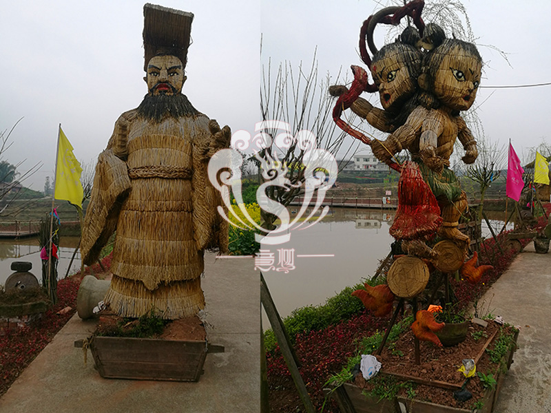 現在的精致稻草人藝術通常是由專業美術老師的造型放樣,然后由焊工師傅焊接出立體造型造型,然后以稻草或者稻草繩為材料編捆制作而成。